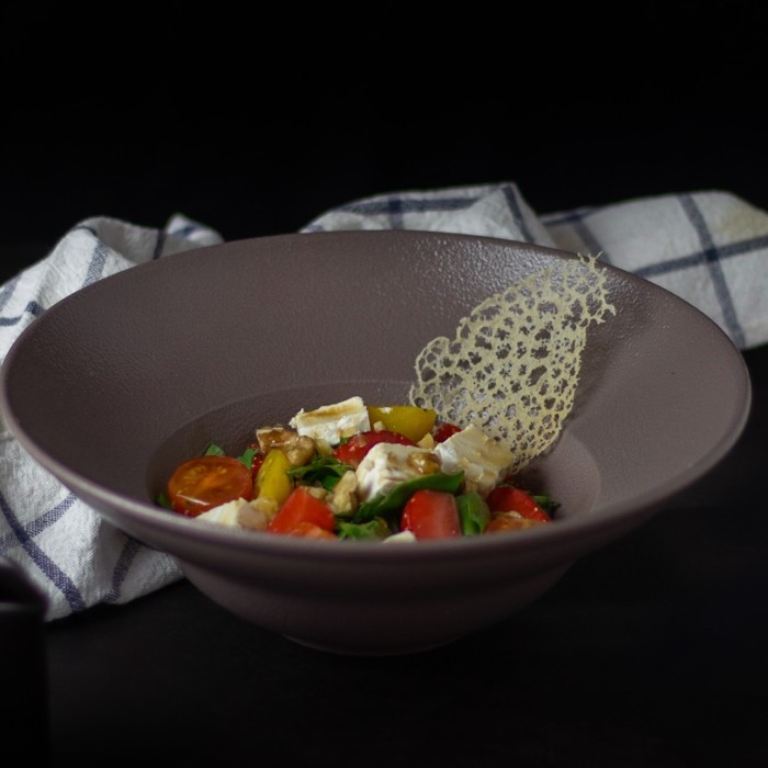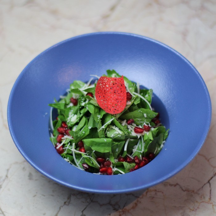 الخليط الرائع المكون من الجرجير والرمان وجبنة البارميزان مضاف إليه الخل والملح وزيت الزيتون والفلفل الأسمر ، ذو مذاق مبهر