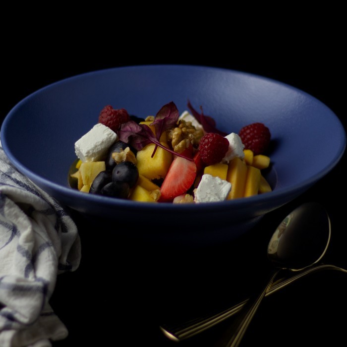 الطبق الصحي المكون من خس إيطالي مع تشكيلة من الفواكة الطازج مع جبن الفيتا و عين الجمل