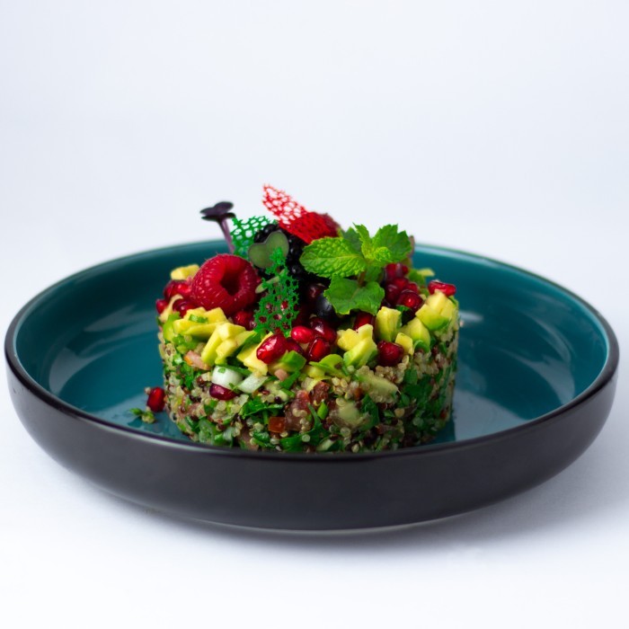 السلطة المميزة المكونة من الكينوا مع البقدونس والطماطم والبصل مع الزيت بالإضافة إلى عصير الليمون، ويزين بحبيبات الرمان الطازج