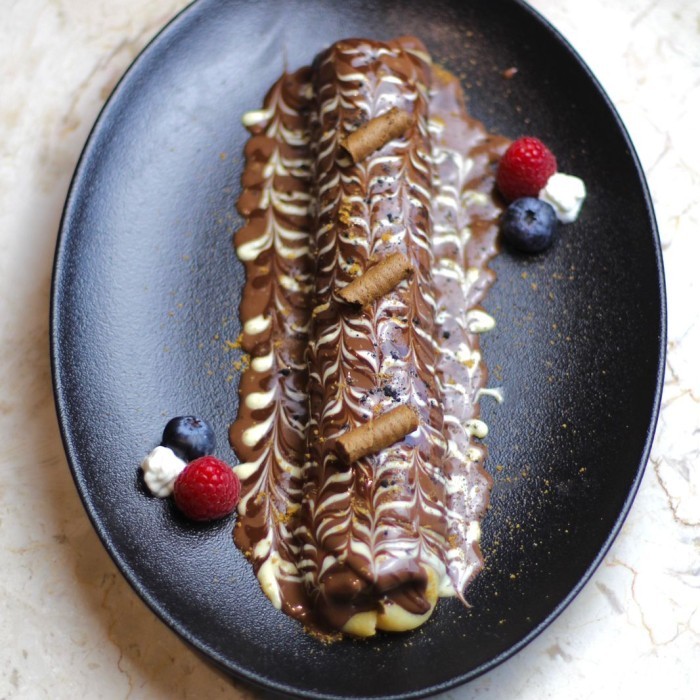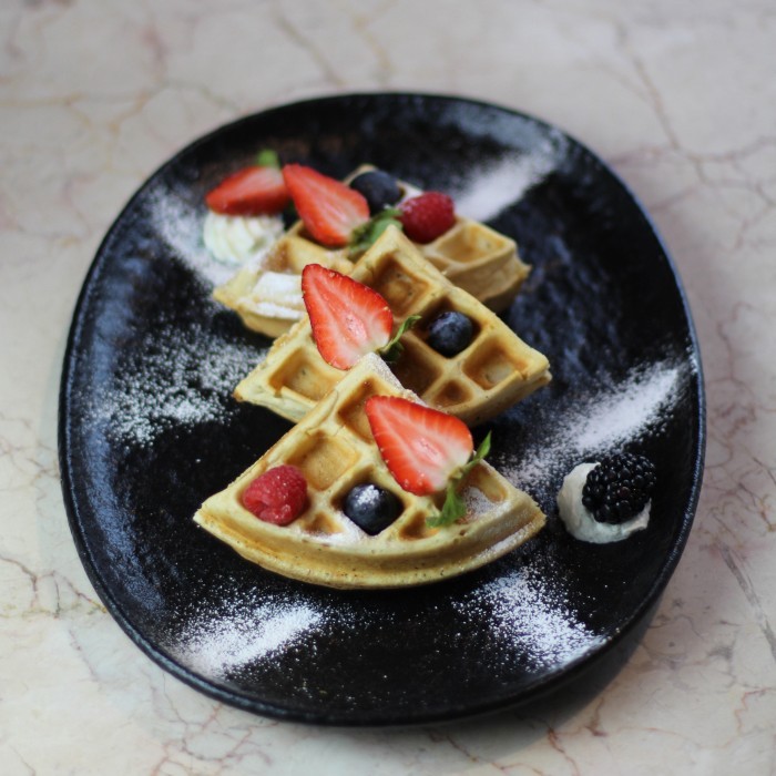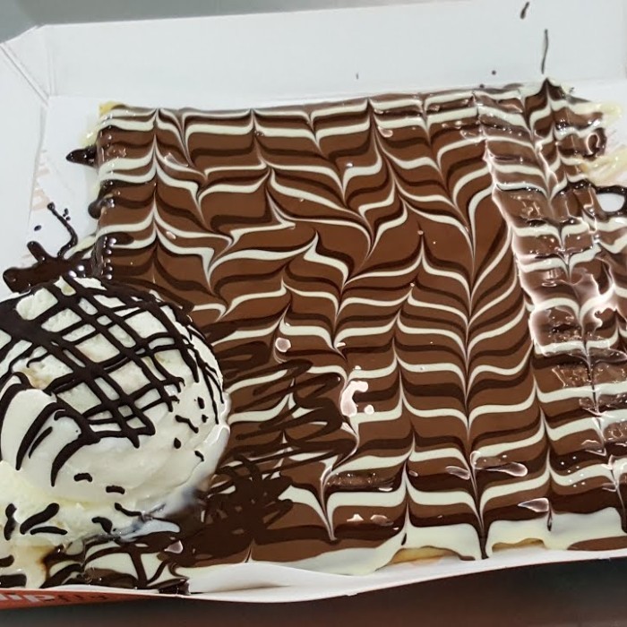 حلوى الوافل الهش من مطعم فيلامس، متوفرة بطعم ( نوتيلا + لوتس ) يضاف اليها الفواكه والمكسرات